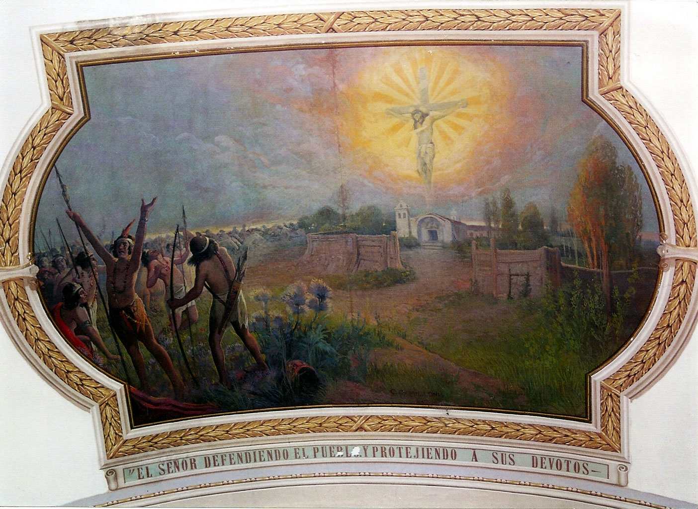 Fresco del techo del templo representando la aparición del Santo Cristo a los aborígenes